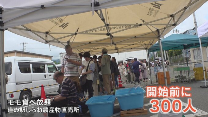 モモの食べ放題はJA南アルプス市の名物イベントで、午前9時の開始前には300人以上の行列ができました。