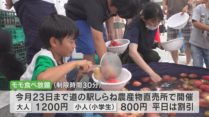 今が旬の山梨のモモが食べ放題というイベントが南アルプス市で始まり、大勢の人で賑わいました。
