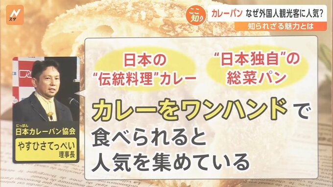 日本カレーパン協会のやすひさてっぺい理事長によりますと、インドカレーではない日本のカレーと、日本独自の惣菜パンを一緒に味わいながら、カレーをワンハンドで食べられると人気を集めているといいます。