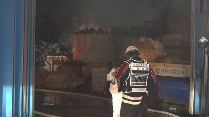 警察と消防によりますと、資材置き場に積み上げられたエアコンや給湯器などの鉄くずから出火したとみられていて、出火から15時間以上が経った今もショベルカーを使って資材を移動させながらの消火活動が行われています。