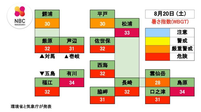 【20日(土) 熱中症警戒アラート】長崎県は「熱中症の危険性が極めて高い気象状況」に 長崎放送 2022年8月19日(金) 17:20 国内 気象庁と環境省は熱中症の危険性が極めて高いとして、長崎県に熱中症警戒アラートを出し、外出をなるべく避け、室内をエアコンなどで涼しい環境にして過ごすよう呼びかけています。 ▼熱中症警戒アラート 20日(土)は、熱中症の危険性が極めて高い気象状況になることが予測されます。 ■予測される 日最高暑さ指数(WBGT) 鰐浦30、厳原32、芦辺31、平戸30、松浦33、佐世保32、西海32、有川34、長崎32、雲仙岳28、島原34、福江32、口之津31、脇岬31 【WBGTの目安】 31~:危険、28~30:厳重警戒、25~27:警戒、~24:注意