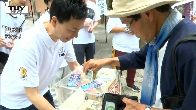 山形の夏の風物詩、「山形大花火大会」まで1か月となったのに合わせ、山形市で募金活動が行われました。