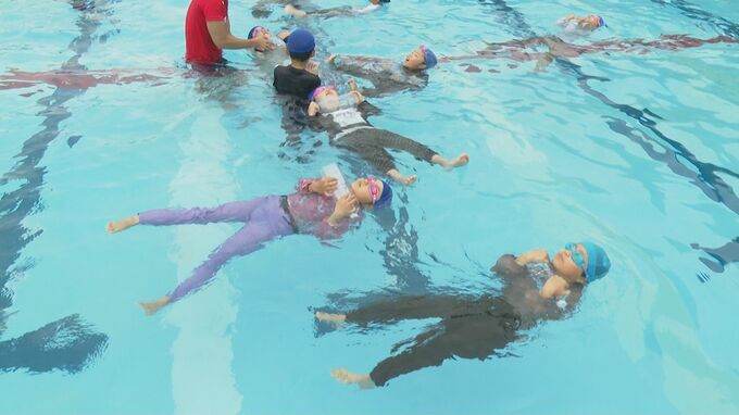 その教訓を生かそうと、児童たちは服を着ていても浮いて救助を待つことができるように訓練を行いました。