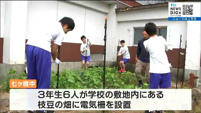 七ヶ宿町ではサルやイノシシなどの野生動物による農作物への被害が毎年発生していて深刻な問題となっています。16日は、七ヶ宿中学校の3年生6人が地元の人から教わりながら、学校の敷地内にある枝豆の畑に電気柵を取り付けました。