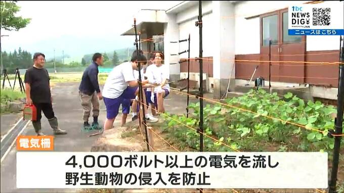 設置された電気柵は4000ボルト以上の電気を流し、野生動物の侵入を防ぎます。七ヶ宿中学校は枝豆が実を付け始める7月下旬から収穫する9月下旬まで電気を流し続けるということです。