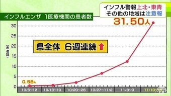6週連続で患者増 青森県内でもインフルエンザの流行拡大 今シーズン初めての警報が「上北」と「東青」に その他のすべての地域には注意報 患者数は県全体で1638人 前週から988人増