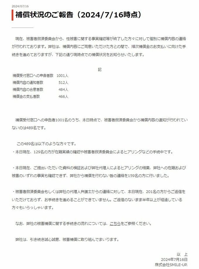 7月16日、「SMILE-UP.」が公式サイト内の「被害補償特設サイト」を更新。