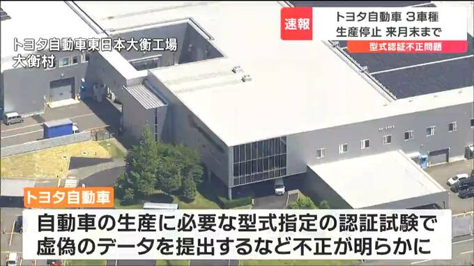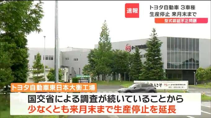 トヨタ自動車が国の認証を不正に取得していた問題を巡り、宮城県大衡村にあるトヨタの子会社の工場では生産を停止している3車種について、少なくとも8月末まで生産停止を延長すると発表しました。