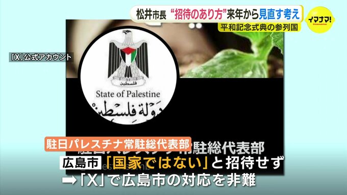 また、今月9日には「国家ではない」という理由で広島市が招待しなかった駐日パレスチナ常駐総代表部が、「被害者であるパレスチナを招待しないのは理解できない」として、SNSで広島市の対応を非難しました。