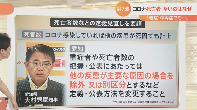 青いグラフが重症者数です。第7波は、重症化率を確かに極めて低い。一方で死亡者を見ると、第6波のピークとほぼ変わらない水準になってきました。これはどういうことが言えるのか、定義づけについて医師に聞きました。
