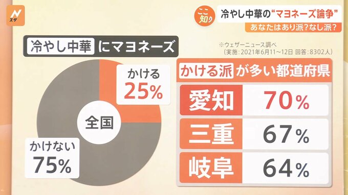 また、マヨネーズをかける人が多い都道府県は、愛知県の70%を筆頭に、三重67%、岐阜64%と東海3県に集中していることがわかりました。