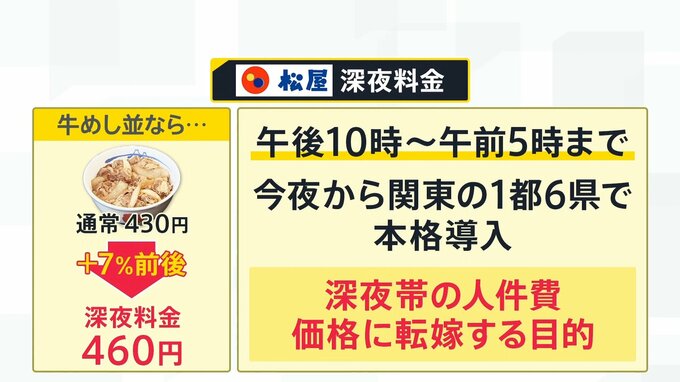松屋は原材料の高騰などを理由に、16日午後、牛めしなど約40品目を値上げしました。さらに、深夜料金として午後10時から午前5時まで、価格に7%前後を上乗せします。