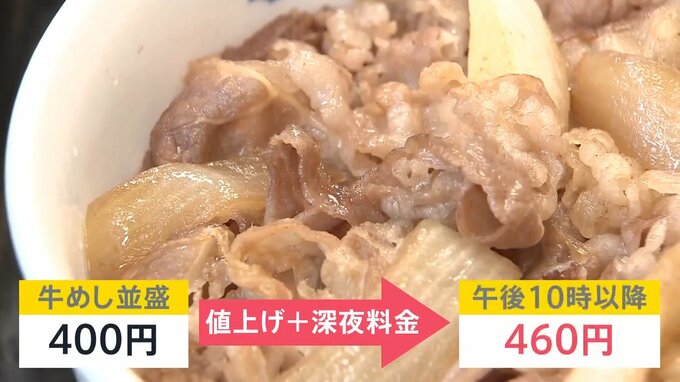 牛めし並盛は値上げと深夜料金で、午後10時以降、400円から460円になりました。