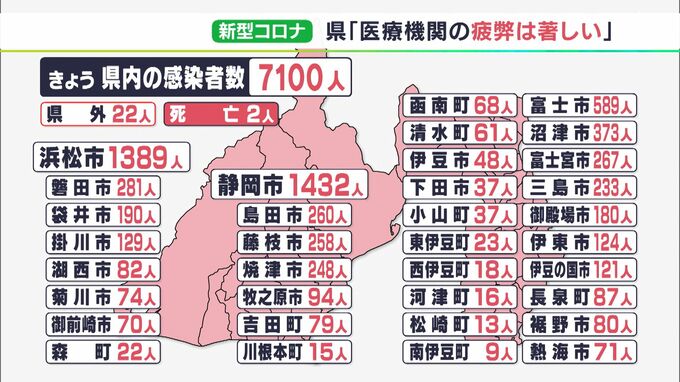 感染者を自治体別に見ますと、静岡市で1432人、浜松市で1389人、富士市で589人、沼津市で373人などとなっています。