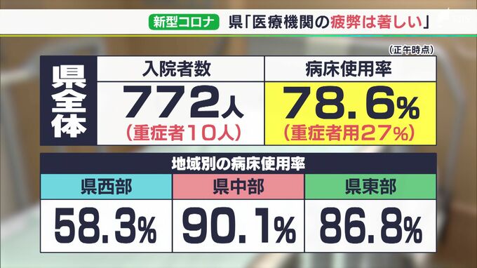 ただ、静岡県全体で727床しかないコロナ専用の確保病床と比較すると、すでにそれを上回る864人が入院している状態で、県は医療機関の疲弊は著しいと説明します。