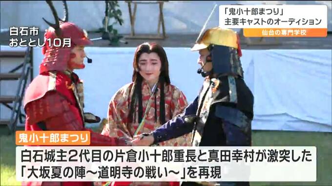 選ばれた7人は、10月5日に白石城本丸広場で開かれる「鬼小十郎まつり」に臨みます。今年で17回目となる「鬼小十郎まつり」ですが、第1回からこの専門学校でオーディションを実施してキャストを抜擢しているということです。