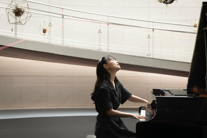 個展の会場である東京・港区南青山の「スパイラルガーデン」に颯爽と現れた大塚さんは、ピアノで自身の楽曲「un」を生演奏。会場に、よりアーティスティックな雰囲気を作り上げると、“胸がいっぱい” と、個展を開けることについて、感慨深げにコメントしました。