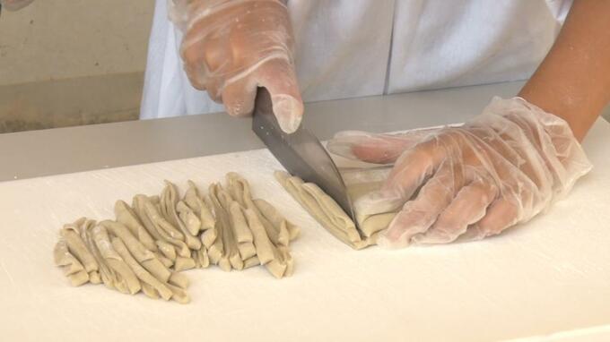 コーヒーとモズク、そしてシソを練り込んだ麺作りでは、同じ細さになるように慎重に切りそろえ冷やし中華に仕上げました。