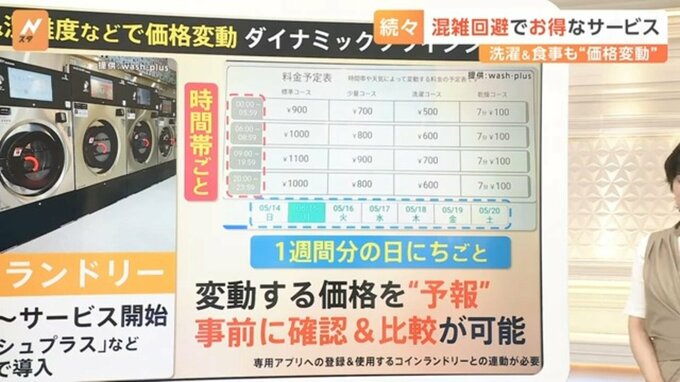 時間帯や需要に応じて価格を調整する『ダイナミックプライシング』が広がりを見せています。コインランドリーの大手チェーンでは2024年4月からサービスを開始。現在、「wash-plus」など13店舗が導入しているそうです。