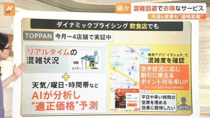利用者は専用アプリ「イマショク」で混雑度を確認できるそうです。また空き状況に応じてポイント付与率UP(ポイントは次回の来店以降使用可)などのサービスが受けられるそうです。