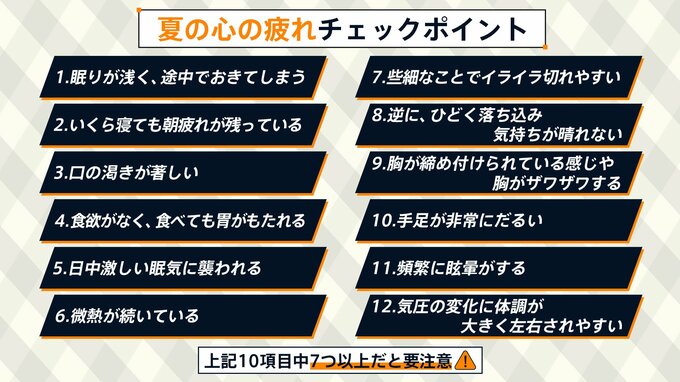 立川院長によると、暑さに疲れてきた8月上旬ごろから「疲れやすい」「よく眠れない」「朝起きられない」などと受診する人が増えるといい、猛暑や気圧変動が大きい年に患者数が増加する傾向にあるという。