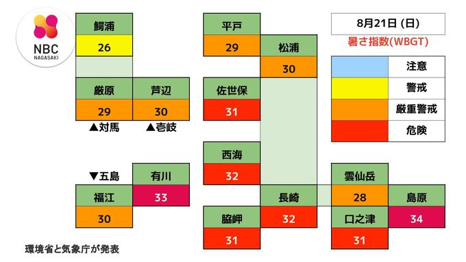 【21日(日) 熱中症警戒アラート】長崎県は「熱中症の危険性が極めて高い気象状況」に 長崎放送 2022年8月20日(土) 17:29 国内 気象庁と環境省は熱中症の危険性が極めて高いとして、長崎県に熱中症警戒アラートを出し、外出をなるべく避け、室内をエアコンなどで涼しい環境にして過ごすよう呼びかけています。 ▼熱中症警戒アラート 21日(日)は、熱中症の危険性が極めて高い気象状況になることが予測されます。 ■予測される 日最高暑さ指数(WBGT) 鰐浦26、厳原29、芦辺30、平戸29、松浦30、佐世保31、西海32、有川33、長崎32、雲仙岳28、島原34、福江30、口之津31、脇岬31 【WBGTの目安】 31~:危険、28~30:厳重警戒、25~27:警戒、~24:注意