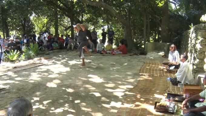 川平地区の豊年祭は地域の男たちが、「ビッチュル石」と呼ばれる重さ約60キロの石を肩に担いで御獄の広場を3回半回り農作物の豊作を祈願します。