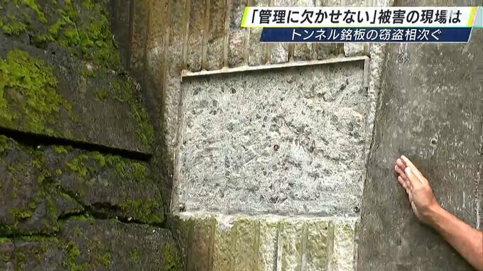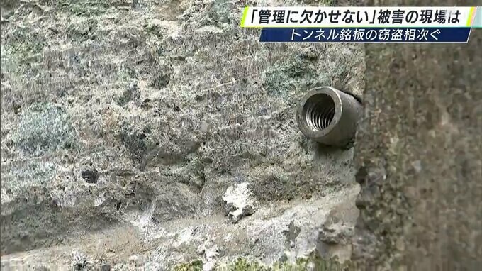 被害があったのは、南伊豆町妻良の「田面トンネル」と「白崎トンネル」、松崎町の「室岩洞トンネル」。田面トンネルでは、北側の出入口の壁面にあった縦40センチ、横60センチの銅製の銘板がなくなりました。