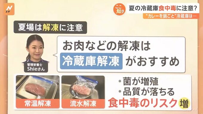 続いては、夏場の解凍についてですが、お肉などの解凍は冷蔵庫解凍がおすすめということです。