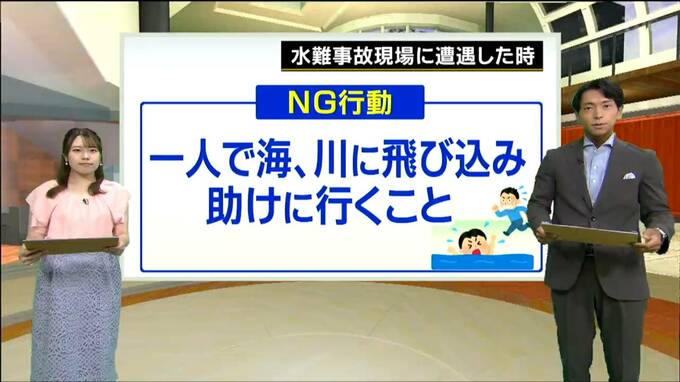 そして、「助けにいくということもしてはならない行為」になります。溺れた人は冷静な行動がとることが難しく、救助者を巻き込む可能性もあります。決して助けるために海や川に飛び込まず、通報したり、浮くものを投げることなどが大切な救助方法になるんですね。