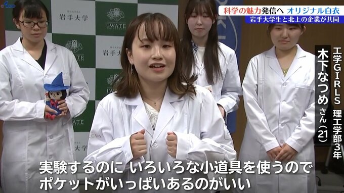 岩手大学理工学部の女性たちのグループと北上市の企業が、イベントなどで使用するオリジナルの白衣を共同で製作し、19日お披露目しました。