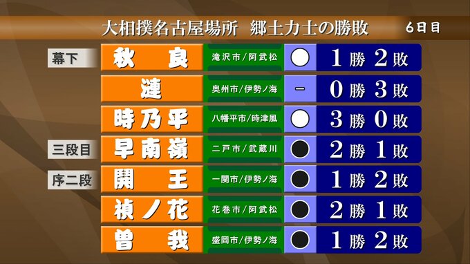 大相撲名古屋場所6日目、郷土力士の取り組みの結果です。