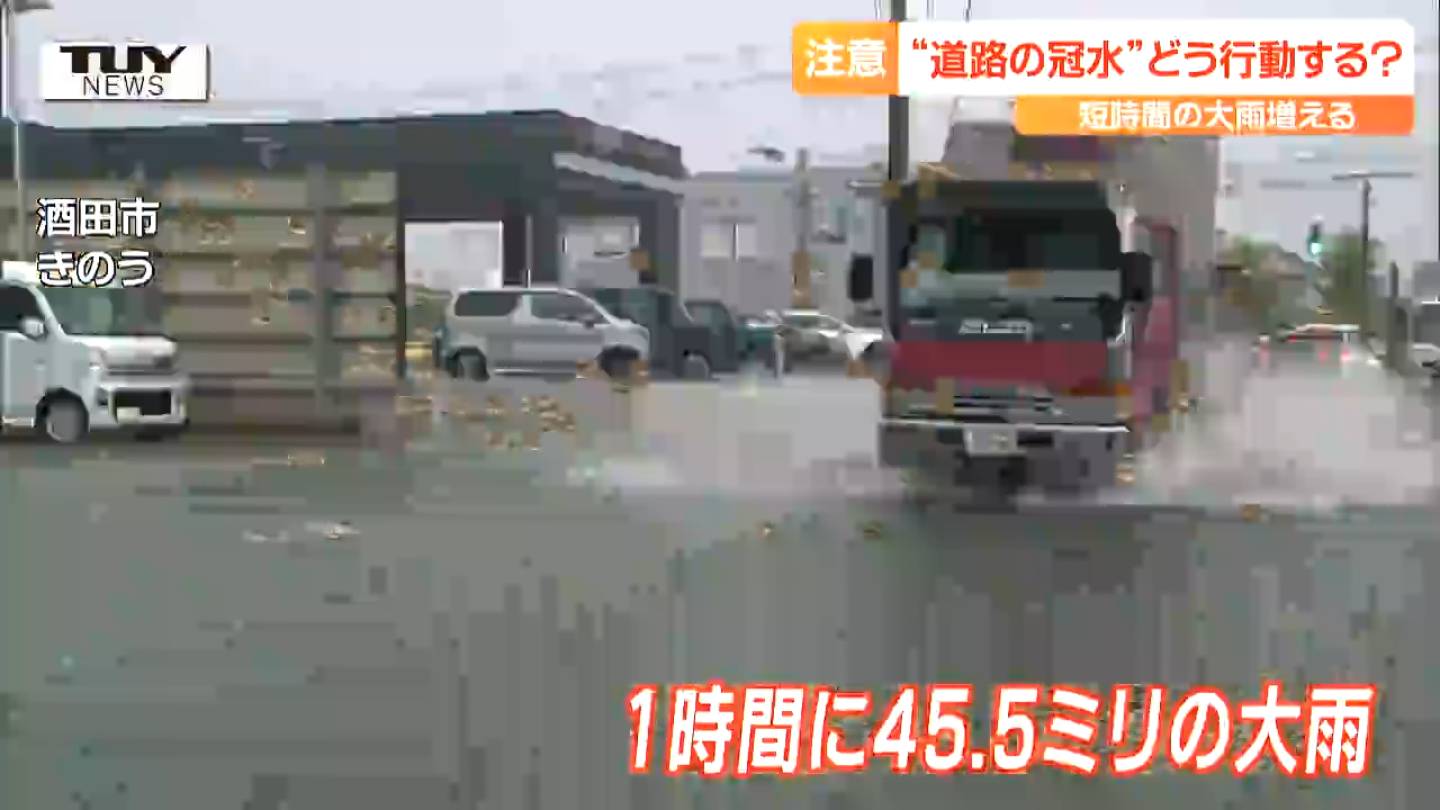 また、きのう酒田市では1時間に45.5ミリの激しい雨が降り、側溝の水が溢れ、道路もご覧の状態に。