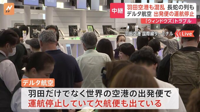 一部でシステムトラブルが起きている羽田空港から中継です。羽田空港の国際線ターミナルに来ています。こちらデルタ航空のチェックインカウンターで、午後5時ごろから運航を停止しているということです。システム…