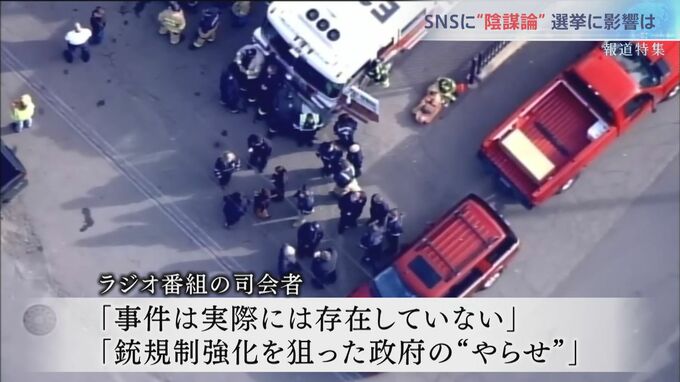 ラジオ番組の司会者が「事件は実際には存在していない」「銃規制強化を狙った政府の“やらせ”だ」と発信し、右派によって陰謀論が広まったという。