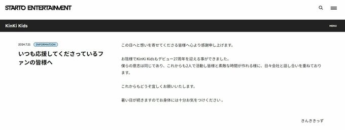 KinKi Kidsが、7月21日、STARTO ENTERTAINMENTの公式サイトで、「デビュー27周年を迎える事ができました」と、ファンに向けてメッセージを綴りました。