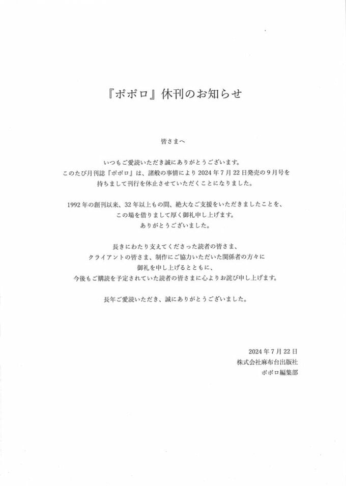 「平素は小社刊行物に格別のご高配を賜りまして、厚く御礼申し上げます。このたび月刊誌『ポポロ』は、諸般の事情により2024年7月22日発売の9月号を持ちまして刊行を休止させていただくことになりました」と報告。