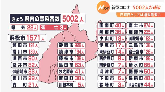 8月21日は静岡県内で新たに5002人が新型コロナウイルスに感染したことが分かりました。感染者は5日ぶりに7000人を下回りましたが、日曜日としては過去最多です。新たな感染者を自治体別に見ますと、浜松市が1571人…