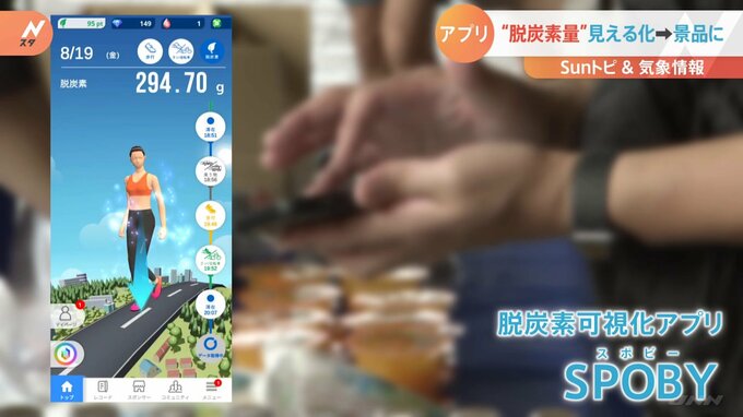 さて、これはスマホですね?はい、そうなんです。こちら、普段の移動方法を少し変えることで、自分にとっても街にとっても嬉しいアプリなんですね。ここは「豊洲場外マルシェ」のイベント会場。その中のこちらのブ…