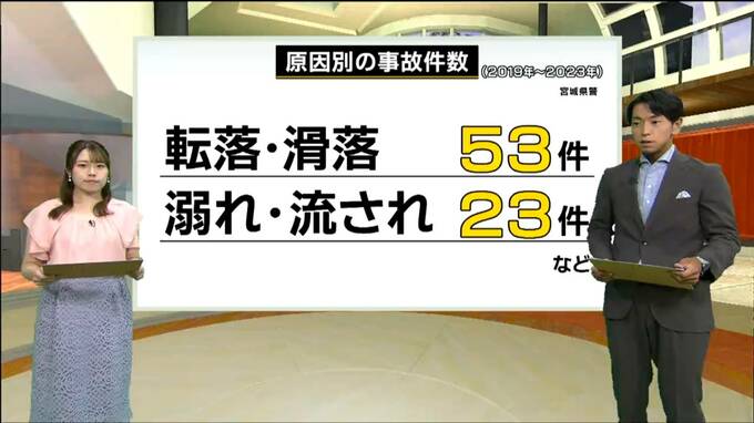 過去5年間の水難事故での原因を見ると、転落や滑落が53件、おぼれ・流されが23件で、転落・滑落が事故原因でもっとも多くなっています。