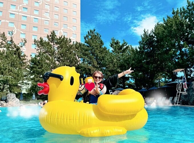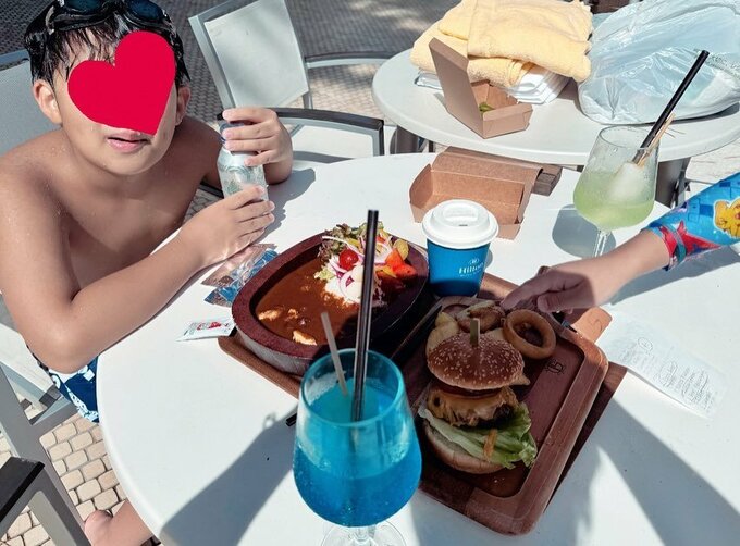 シャチの浮き輪で泳ぐ二人を引っ張る杉浦さんの様子や大きなハンバーガーを食べる様子を投稿し、「最高の夏休みの始まりです❤️」と綴りました。
