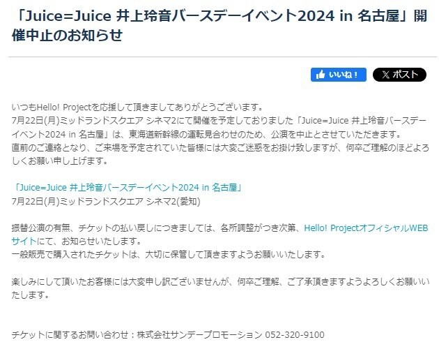 ハロプロの公式サイトでは、「Juice=Juice 井上玲音バースデーイベント2024 in 名古屋」開催中止のお知らせと題し、「7月22日(月)ミッドランドスクエア シネマ2にて開催を予定しておりました『Juice=Juice 井上玲音バースデーイベント2024 in 名古屋』は、東海道新幹線の運転見合わせのため、公演を中止とさせていただきます」と、東海道新幹線の運転見合わせのため、やむを得ず中止すると発表しました。