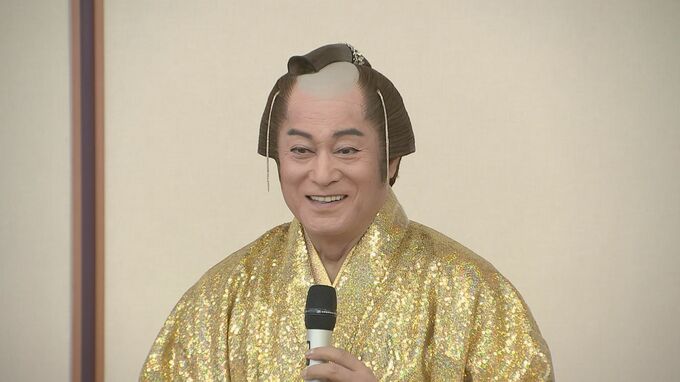 松平さんは、会見に「マツケンサンバⅡ」でおなじみの黄金の着物姿で登場。