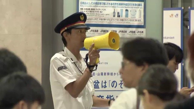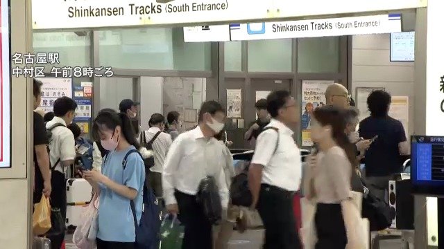 「午前8時すぎの名古屋駅です。新幹線の改札口は大変混雑していて駅員が対応に追われています」
