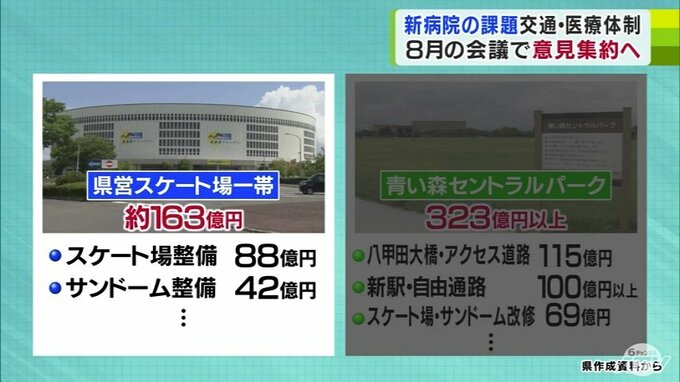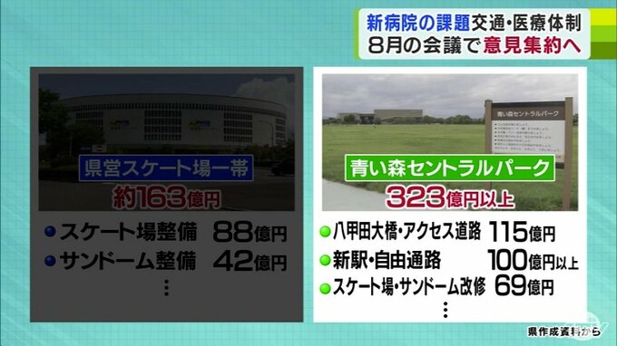 有識者会議では、県の担当者が統合新病院を建設する候補地の「県営スケート場一帯」と「青い森セントラルパーク」のメリット・デメリットを記した資料を基に出席者に説明しました。