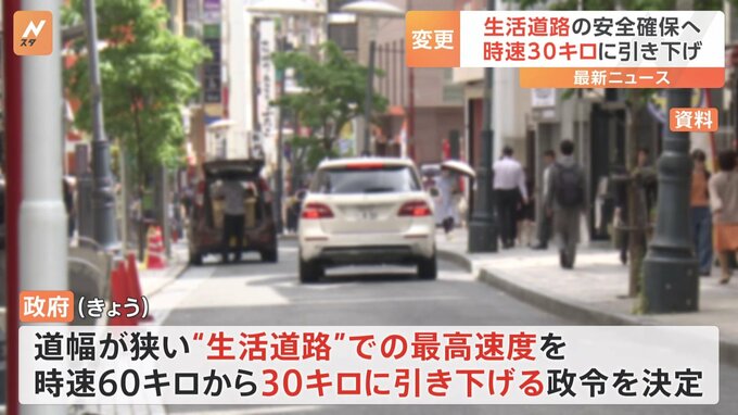 政府はきょうの閣議で、センターラインなどがなく道幅が狭い、いわゆる“生活道路”での自動車の最高速度を現在の時速60キロから30キロに引き下げる政令について決定しました。警察庁によりますと、時速30キロ以上…