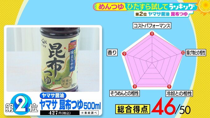 第2位は、ヤマサ醤油の『ヤマサ 昆布つゆ500ml』(税込427円 ※番組調べ)。
