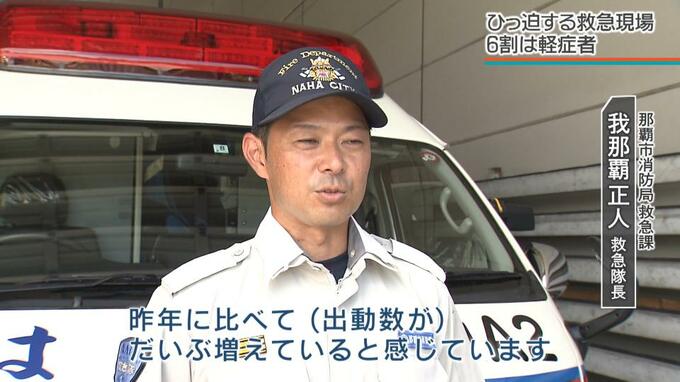 今年度、那覇市の情報指令センターで119番通報を受理し、出動した件数は1日平均74件ですが、13日には今年度最多の114件を記録。ひっ迫しています。