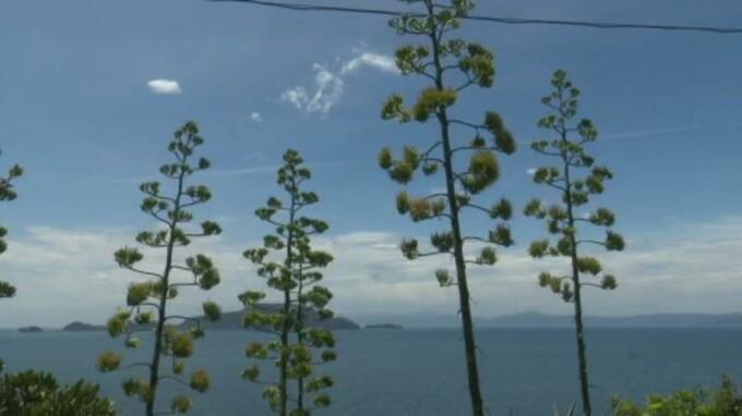 数十年に一度しか咲かないといわれる、「リュウゼツラン」が愛媛県八幡浜市内で何と6本一気に開花し、夏空に向かって茎を高く伸ばしています。八幡浜市穴井を走る国道378号沿いの海に面した崖では、現在、6本…