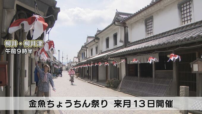 山口県柳井市の夏の風物詩「金魚ちょうちん祭り」を前に23日、街なかに金魚ちょうちんが飾りつけられました。